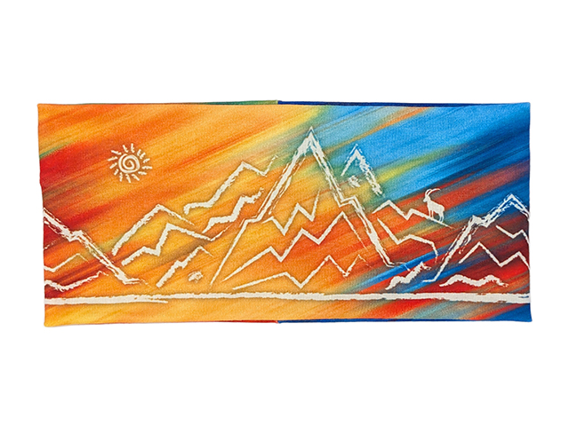 Dieses Stirnband zeigt einen lebendigen, geometrischen Farbverlauf in Blau-, Türkis-, Lila- und Orangetönen. Die weiße, skizzenhafte Berglandschaft mit kleiner Sonne und einem Steinbock auf dem Gipfel verleiht ihm einen frischen, alpinen Look. Material Der Stoff ist ein Modern Jersey mit 210 Gramm pro m². Weicher und elastischer Polyester-Jersey für eine Vielzahl von Bekleidungsanwendungen wie in unserem Fall den Stirnbändern. Dehnbares, geschmeidiges und knitterfreies synthetisches Strickgewebe mit einem Hauch von Lycra. Waschanleitung Bei einer Temperatur von bis zu 40°C waschen und ein Programm für synthetische Stoffe verwenden. Mit hoher Schleuderdrehzahl schleudern. Verwenden Sie keine Bleichmittel. Zum Trocknen aufhängen oder bei niedrigster Temperatur im Wäschetrockner trocknen.