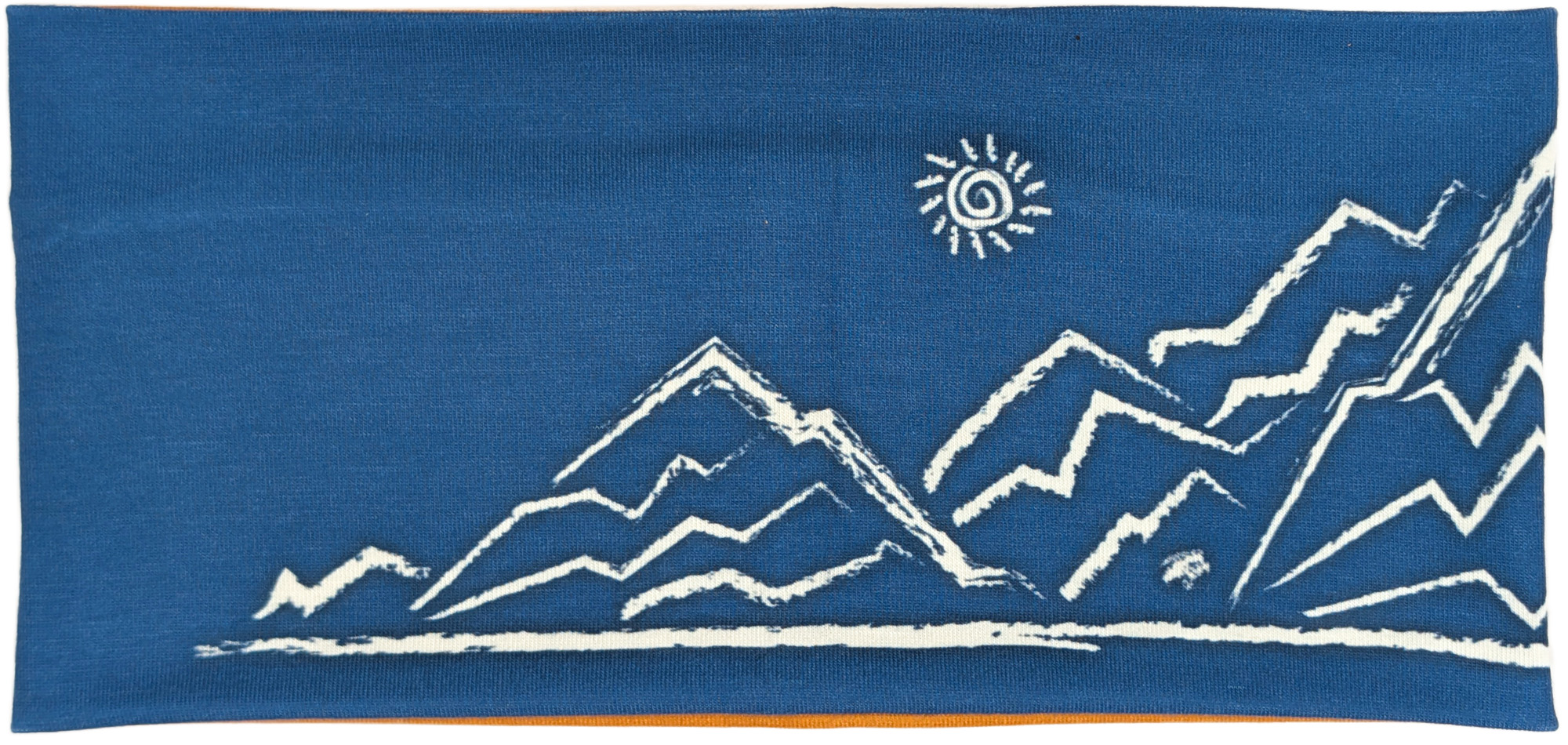 Dieses Stirnband kombiniert ein mittleres Jeansblau mit einem diagonalen Einsatz in warmem Senforange. Die cremefarbene, skizzenhafte Berglandschaft mit kleiner Sonne und einem Steinbock auf einem der Gipfel sorgt für einen sportlich-alpinen Look.