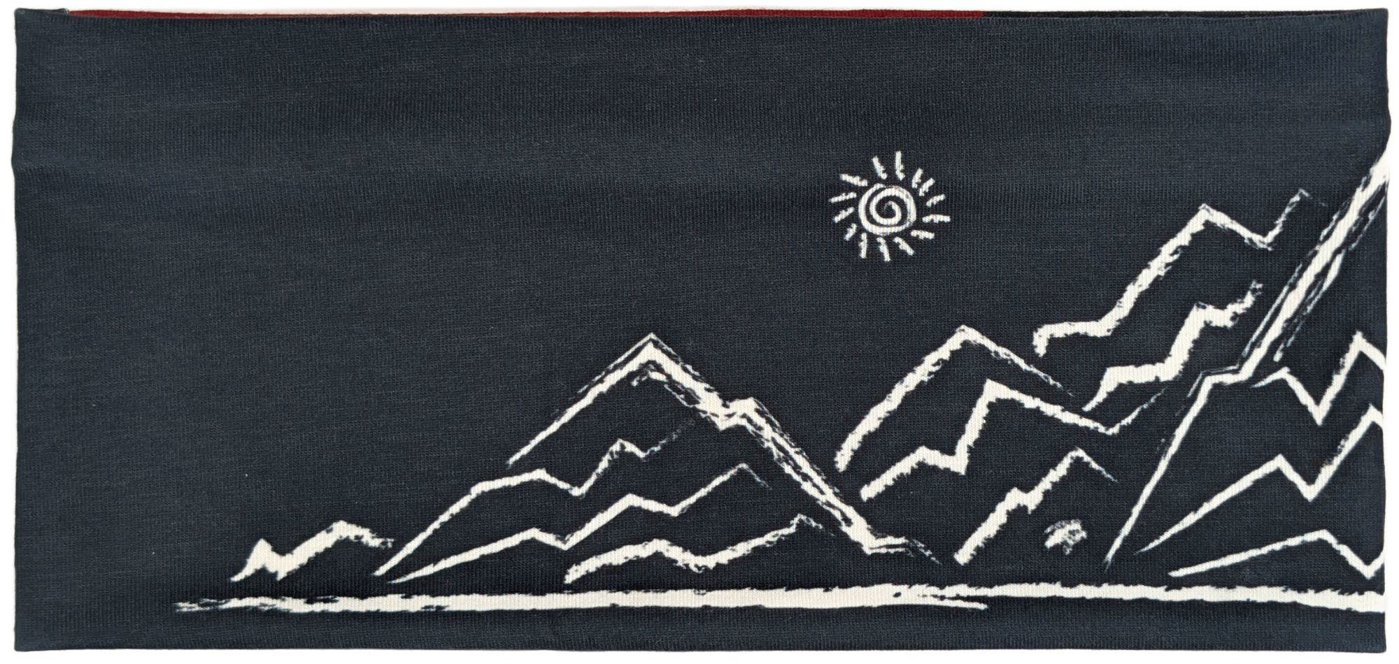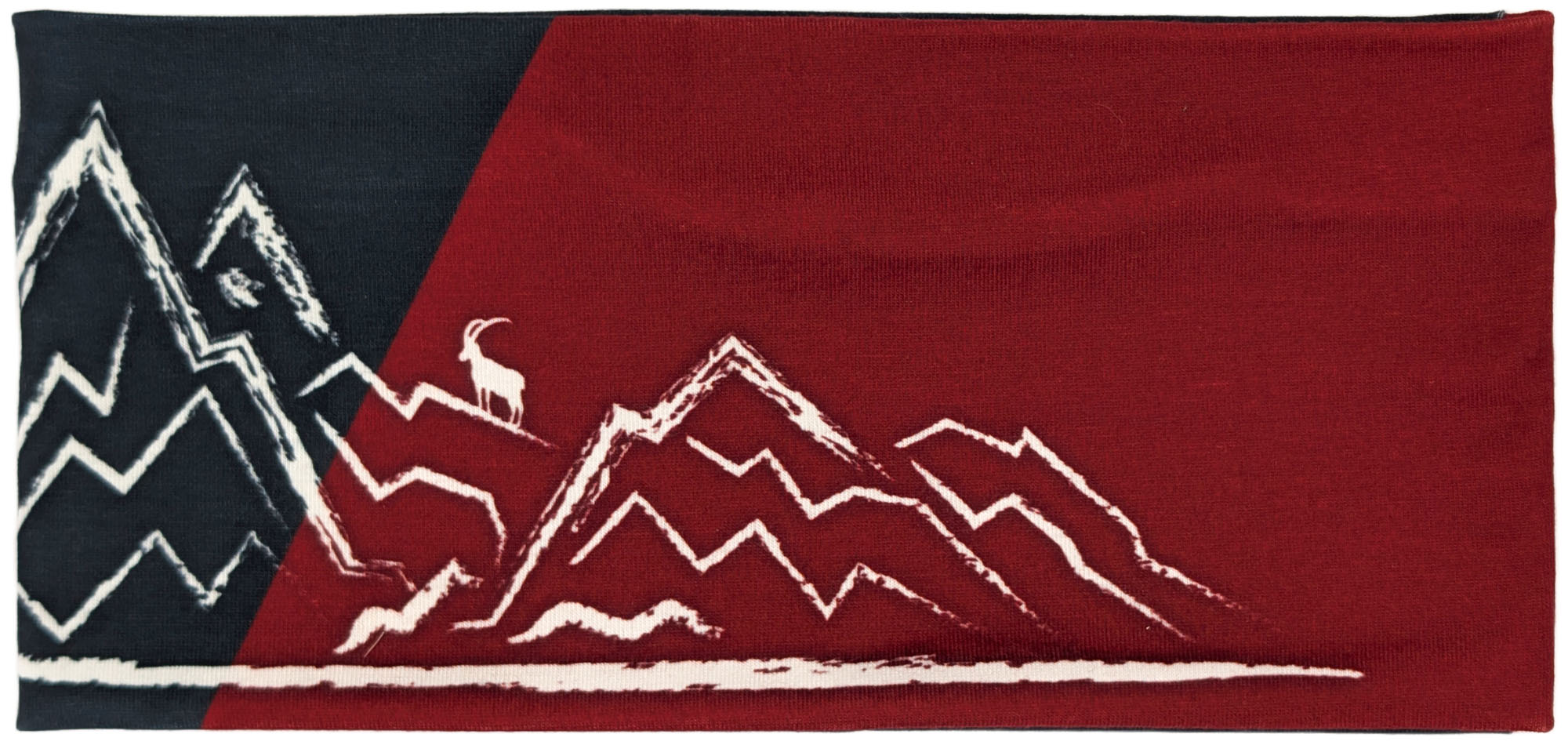 Dieses Stirnband kombiniert dunkles Anthrazit-Blau mit einem diagonalen Einsatz in tiefem Bordeauxrot. Die cremefarbene, skizzenhafte Berglandschaft mit kleiner Sonne und einem Steinbock auf einem der Gipfel verleiht ihm einen markanten, alpinen Look.