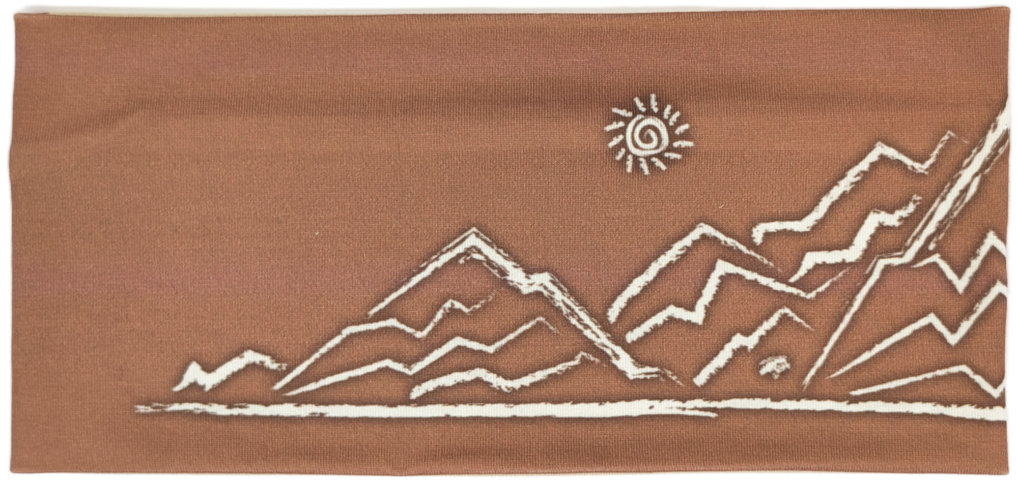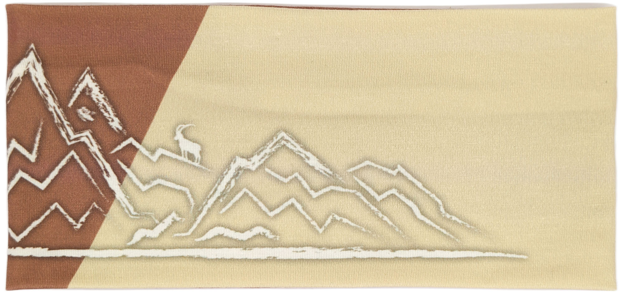 Dieses Stirnband kombiniert warmes Braun mit einem diagonalen Einsatz in hellem Beige. Die cremeweiße, skizzenhafte Berglandschaft mit kleiner Sonne und einem Steinbock auf einem der Gipfel sorgt für einen ruhigen, alpinen Look.
